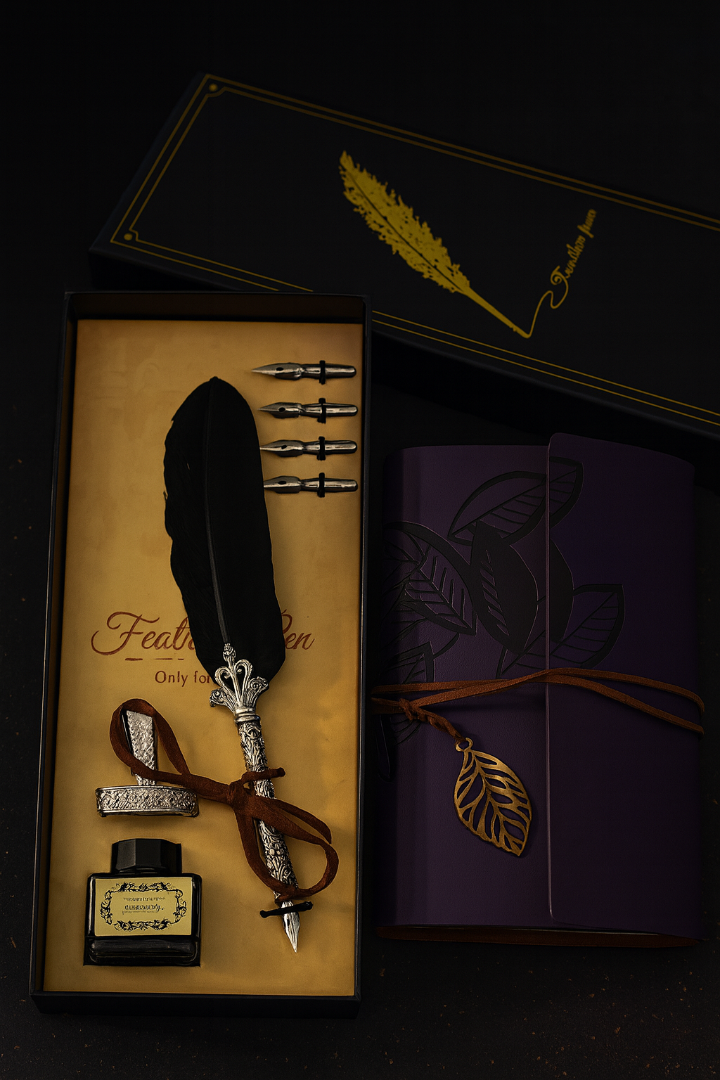 Mor Deri Hatıra Defteri & Tüylü Divit Kalem Hediye Seti