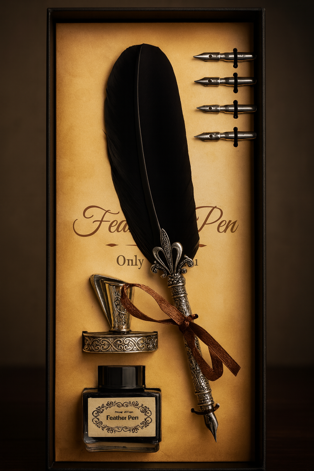 Set içerisinde tüy tasarımlı divit kalem yer almakta olup ucu metal işlemelidir. Kalemle uyumlu olarak 5 farklı yazı başlığı, masaüstü kalem aparatı ve mürekkep şişesi setle birlikte sunulmaktadır.